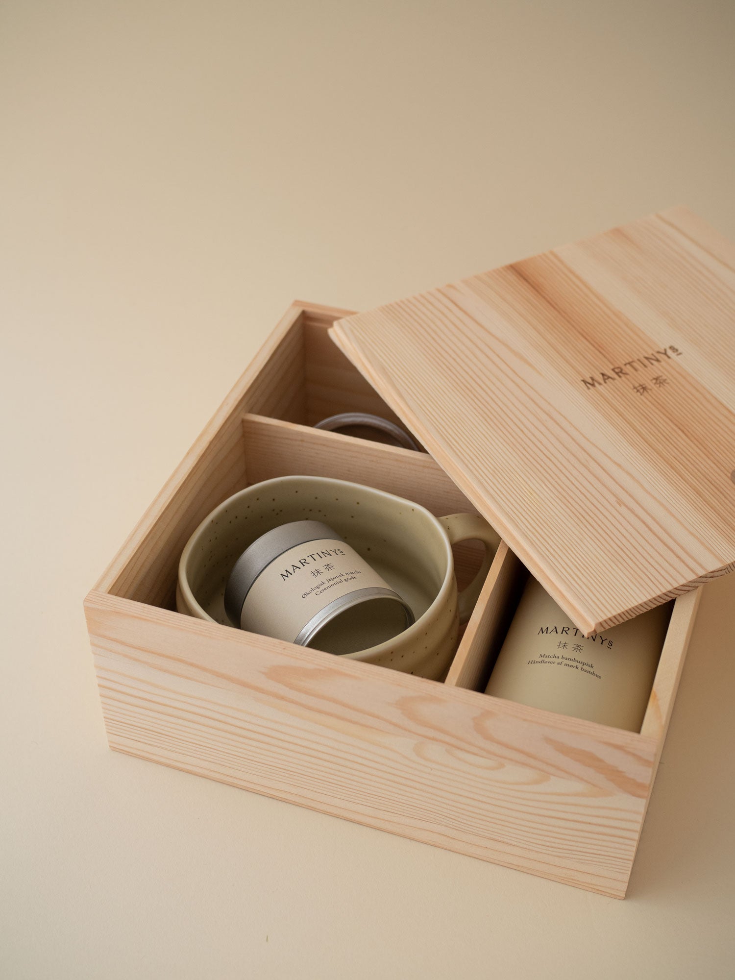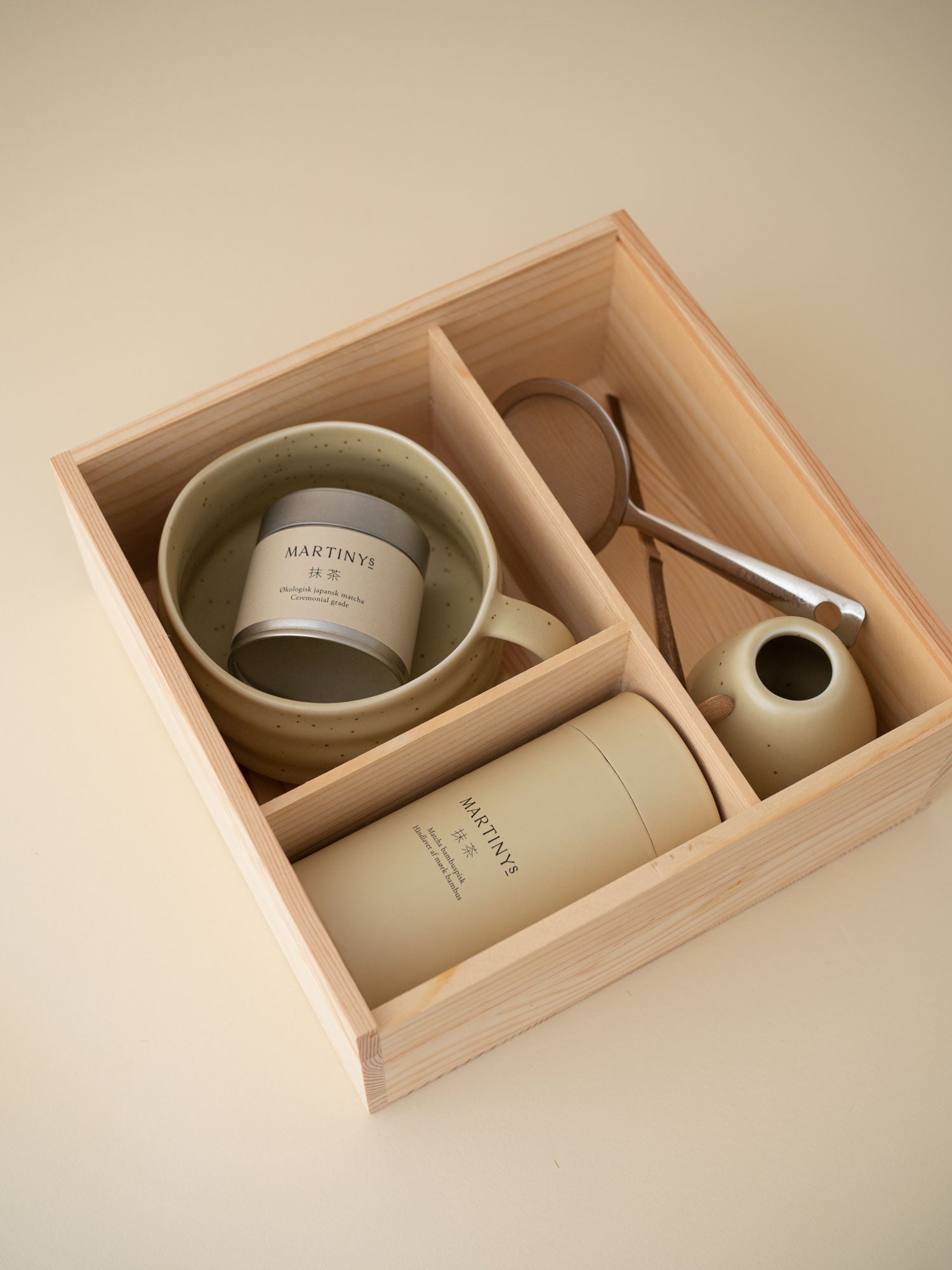 - Matcha sættet er pakket i en smuk træ-æske og indeholder alle essentielle redskaber.